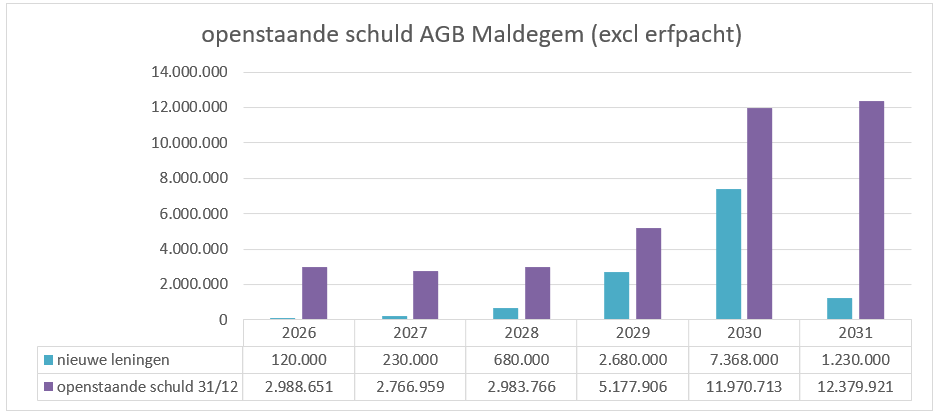 In 2031 zijn er geen bankleningen meer in het AGB, en zijn er alleen nog openstaande leningen ten aanzien van de gemeente. Als men de totale schuld van het lokaal bestuur Maldegem bekijkt, dan mag men deze intra-company leningen (toegestane renteloze leningen) niet meenemen om de totale schuld te analyseren.