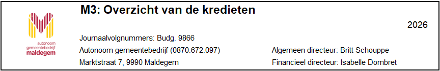 Dit schema geeft per budgettaire entiteit de kredieten weer voor de uitgaven en de ontvangsten. Het is op dit niveau dat de kredietbewaking van belang is. Indien één van die cijfers zou moeten wijzigen, dan is een aanpassing van het meerjarenplan nodig. De kredieten van 2026 worden zoals in onderstaande tabel vastgesteld.