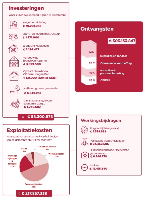 Lokale besturen staan onder zware druk. Federale en Vlaamse hervormingen leiden tot dalende inkomsten, terwijl opeenvolgende indexeringen de loonkosten fors doen stijgen. Tegelijk verdwijnen diverse financiële stimuli voor onder meer hernieuwbare energie, ouderenzorg en ontwikkelingssamenwerking. Het OCMW ervaart extra uitdagingen door de beperking van werkloosheid in de tijd. Daarbovenop stijgen de personeels- en werkingskosten bij intercommunales, waardoor zij hogere dotaties vragen aan lokale besturen om hun werking te garanderen. De uitdagingen zijn groot, maar Maldegem kiest voor oplossingen met visie, ambitie en volharding.