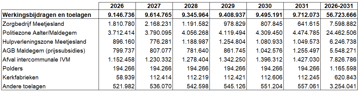 De dotatie aan Politiezone Aalter/Maldegem verhoogt significant ter financiering van een voltallig personeelskader, waarbij er 17 extra personen worden aangeworven. De dotatie aan de hulpverleningszone Meetjesland varieert jaar per jaar, deze is afhankelijk van de geplande investeringen in grote voertuigen, zoals multifunctionele autopompen in 2028.