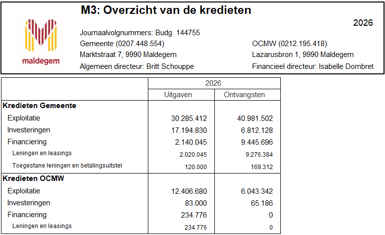 Dit schema geeft per budgettaire entiteit (Gemeente en OCMW) de kredieten weer voor de uitgaven en de ontvangsten. Het is op dit niveau dat de kredietbewaking van belang is. Indien één van die cijfers zou moeten wijzigen, dan is een aanpassing van het meerjarenplan nodig. De kredieten van 2026 worden zoals in onderstaande tabel vastgesteld.
